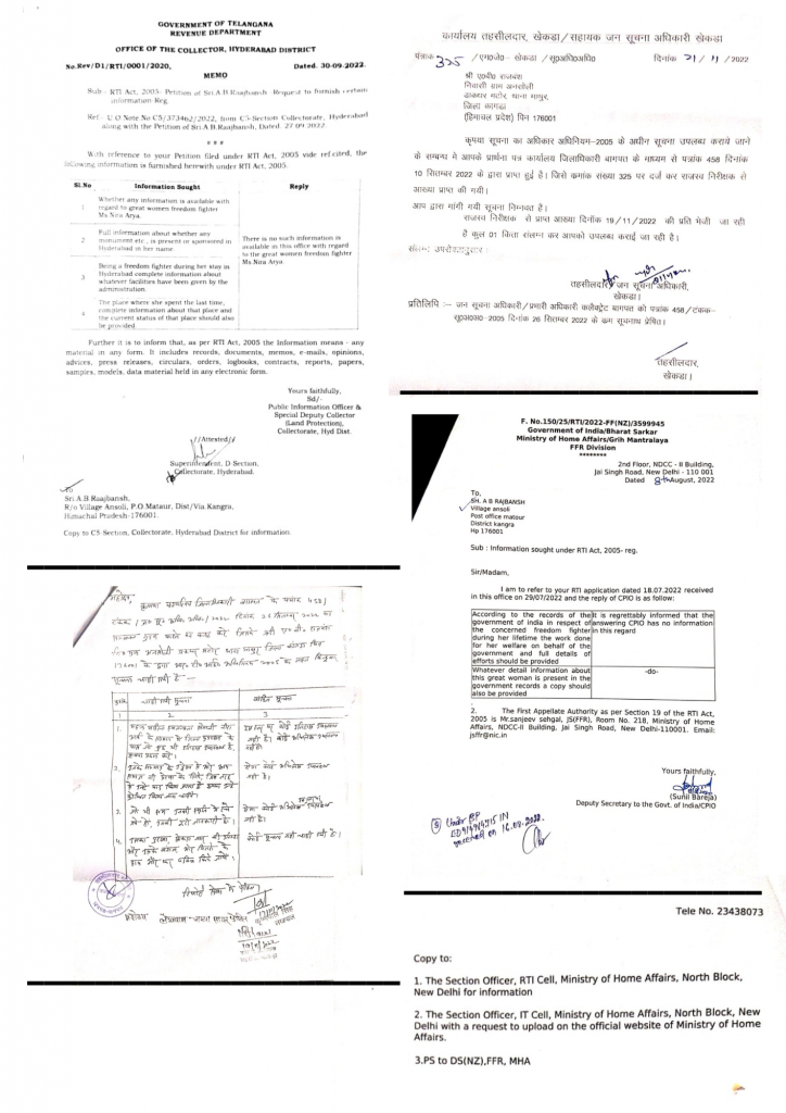 कांगड़ा जिला के गांब अनसोली निबासी एक सोशल एक्टिविस्ट ए.बी. राजबंश ने इसी महान महिला के बारे में उचित जानकारी प्रदान करने हेतू भारत सरकार, गृह मंत्रालय, नीरा आर्य का पैदयशी जिला के कलेक्टरेट बागपत ( उत्तर प्रदेश ) और (मृत्यु स्थल )कलेक्टर, हैदराबाद (तेलंगाना ) को सुचना का अधिकार अधिनियम के तहत आवेदन किये गये थे l गृह मंत्रालय से पत्रांक : F.No./25/RTI /2022-FF/(NZ) 2599945 दिनांक 8/8/2022 के तहत स्पस्ट किया गया कि इस बिरंगना नीरा आर्य बारे कोई अभिलेख या जानकारी भारत सरकार के पास नहीं है l इसी प्रकार, तहसीलदार खेकड़ा (उ.प्र.) और कलेक्टरेट हैदराबाद से भी ऐसे ही निराशाजनक उत्तर प्राप्त हुए कि उन्हें इस बारे कोई जानकारी नहीं है l ऐसी है हमारी व्यबस्था, जिसके बारे में क्या बोला जाये यह इस खबर को पढ़ने वाले पाठकों गण पर ही छोड़ते हैं l