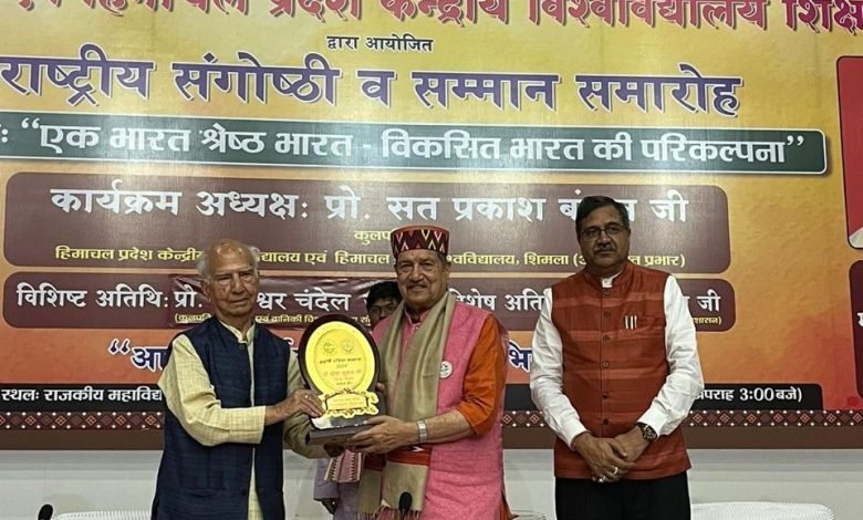हिमाचल प्रदेश केंद्रीय विश्वविद्यालय के शिक्षक संघ और विश्वविद्यालय के हिंदी भाग के संयुक्त तत्वावधान में महर्षि वशिष्ठ सम्मान – 2024 और स्वामी सत्यानंद सोक्स सम्मान – 2023 प्रदान किया गया। एक विशेष कार्यक्रम में यह सम्मान दिया गया। इस मौके पर एक भारत, श्रेष्ठ भारत: एक विकसित भारत का परिकल्पना पर एक संगोष्ठी का आयोजन किया गया । विश्वविद्यालय के ऑडिटोरियम में इस कार्यक्रम का आयोजन हुआ था। इसमें हिमाचल प्रदेश के पूर्व मुख्यमंत्री, राजनेता, विशिष्ट लेखक माननीय शांता कुमार जी बतौर मुख्य अतिथि के रूप में उपस्थित थे । उन्होंने प्रदीप प्रज्वलन करके कार्यक्रम का श्री गणेश किया । इस अवसर पर विशिष्ट लेखक व चिंतक डॉ. इंद्रेश कुमार को प्रतीक चिन्ह और प्रशस्ति पत्र के साथ-साथ विश्वविद्यालय के शिक्षक संघ की ओर से ब्राह्मर्षी वशिष्ठ सम्मान- 2024 से सम्मानित किया गया। इस मौके पर विश्वविद्यालय के कुलपति ने विश्वविद्यालय की ओर से प्रशस्ति पत्र और चंबा की पारंपरिक हस्तकला प्रदान करके उन्हें सम्मानित किया । अपने वक्तव्य में डॉक्टर इंद्रेश कुमार ने यह कहा कि भारत में भौगोलिक विविधता दिखाई पड़ती है, बावजूद इसके इसकी सांस्कृतिक विरासत एक है। इसीलिए वह अनन्य है, अनूठी है । हम यहीं से, इन्हीं बातों से विकसित भारत की परिकल्पना कर सकते हैं। उन्होंने रामचंद्र व माता शबरी के प्रसंग के जरिए रामायणयुगीन समाज की महान सामाजिक पृष्ठभूमि की व्याख्या की थी। उन्होंने आगे कहा था कि मैं अपने जीवन में कभी ब्रह्मर्षि वशिष्ठ के समान बन सकूंगा, ऐसी कल्पना मैं नहीं कर पा रहा हूं । इस सम्मान ने मेरी जिम्मेदारी को बढ़ा दिया है । इस मौके पर दूसरी बार स्वामी सत्यानंद स्कोक्स सम्मान प्रदान किया गया था । यशवंत सिंह परमार उद्यान खेती और वन विज्ञान विश्वविद्यालय नौणी, हिमाचल प्रदेश के कुलपति तथा वैज्ञानिक प्रोफेसर राजेश्वर सिंह चंदेल को अपनी आजीवन साधना के लिए स्वामी सत्यानंद स्कोस्क सम्मान- 2023 से सम्मानित किया गया । उन्होंने स्वामी सत्यानंद ने किस तरह सेब की खेती में एक क्रांतिकारी परिवर्तन ला खड़ा किया था उस पर विस्तार से चर्चा की। साथ ही स्वामी सत्यानंद जी किस तरह मिशनरी से हिंदू संन्यासी बने उस पर भी बड़ी ही रोचक पूर्ण शैली में विस्तार पूर्वक बताया। मुख्य अतिथि पूर्व मुख्यमंत्री शांता कुमार जी ने अपने अभिभाषण में डॉ. इंद्रेश कुमार के साथ पांच दशक से अधिक समय तक उनके निजी संबंधों की स्मृतियों को सबके सामने संजोया । संगोष्ठी के विषय पर भी उन्होंने अपने विचार रखे। उनके अभिभाषण में समकालीन समाज और सभ्यता की स्थिति व गति साफ-साफ झलक रही थी। बतौर सम्मानित अतिथि के रूप में पधारे निर्वीसित तिब्बत सरकार के सुरक्षा 