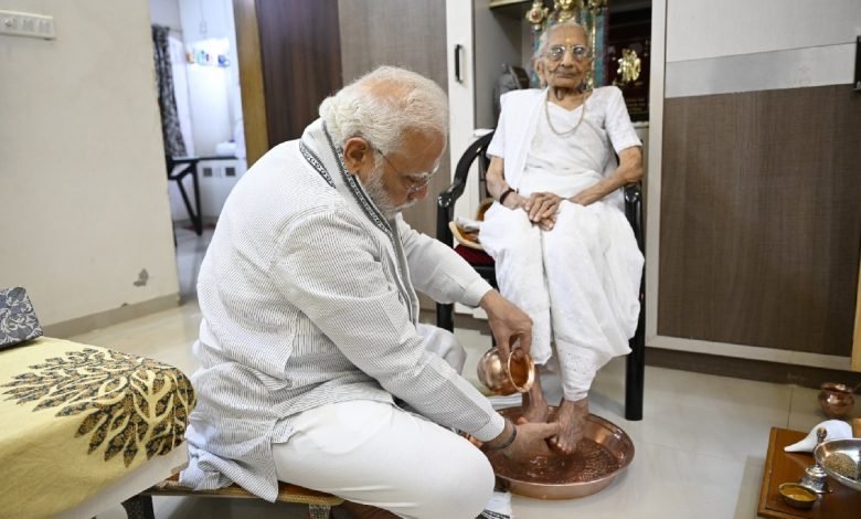 प्रधानमंत्री मोदी की मां का आज जन्मदिन है। हीराबेन आज 100वें साल में प्रवेश कर रही हैं। मां के जन्मदिन पर प्रधानमंत्री मोदी अहमदाबाद पहुंचे। अपनी मां के पैर धोए, उसके बाद उस पानी को आंखों से लगाया। मोदी ने अपनी मां के साथ बैठकर पूजा की, उन्हें शॉल ओढ़ाया और उनका आशीर्वाद लिया।
